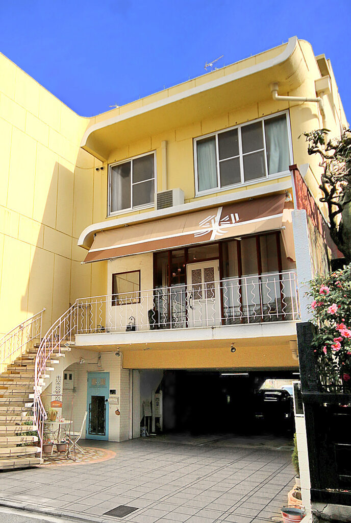▼外階段から上がる、ラッピング専門店「京のつつみ屋小箱」の空き時間を利用しています。